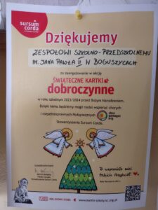 W dniu 6 grudnia 2023 r. w Zespole Szkolno-Przedszkolnym im. Jana Pawła II w Boguszycach odbyła się akcja charytatywna pt. „Świąteczne Kartki Dobroczynne”. Samorząd uczniowski wraz z pedagogiem szkolnym zorganizowali akcję na terenie szkoły, rozpowszechnili informacje wśród uczniów i zebrali docelową kwotę, która została przekazana na stowarzyszenie Sursum Corda (w górę serca), które wspiera i pomaga chorym i niepełnosprawnym dzieciom i ich rodzicom. Dziękujemy za pomoc i zaangażowanie.